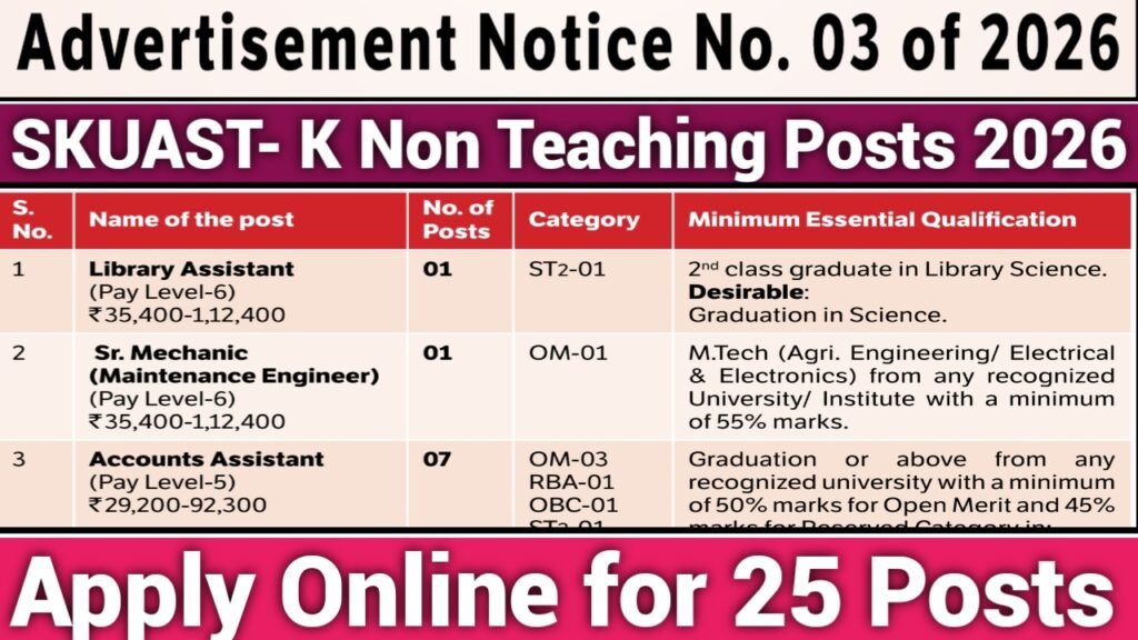 SKUAST K Non Teaching Posts 2026: The Sher-i-Kashmir University of Agricultural Sciences & Technology, Kashmir has released a notification for