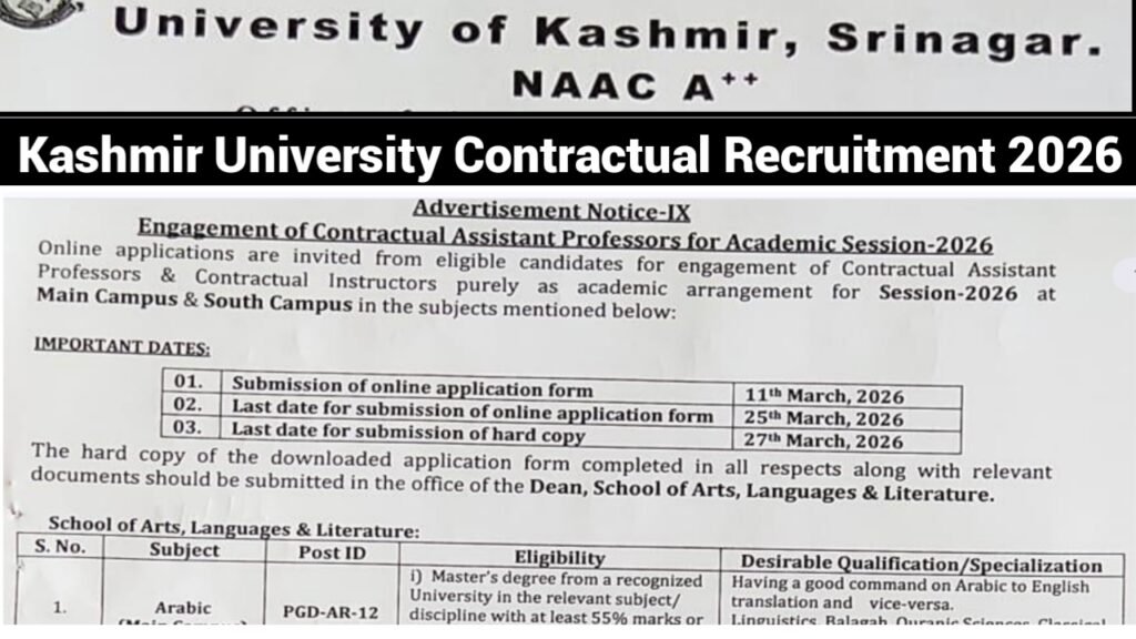 Kashmir University Contractual Recruitment 2026: The University of Kashmir has released a notification for the engagement of contractual assistant professors