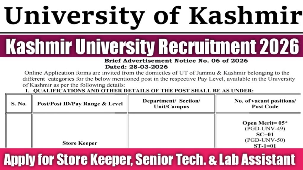 Kashmir University Recruitment 2026 Apply for Store Keeper, Senior Tech. & Lab Assistant